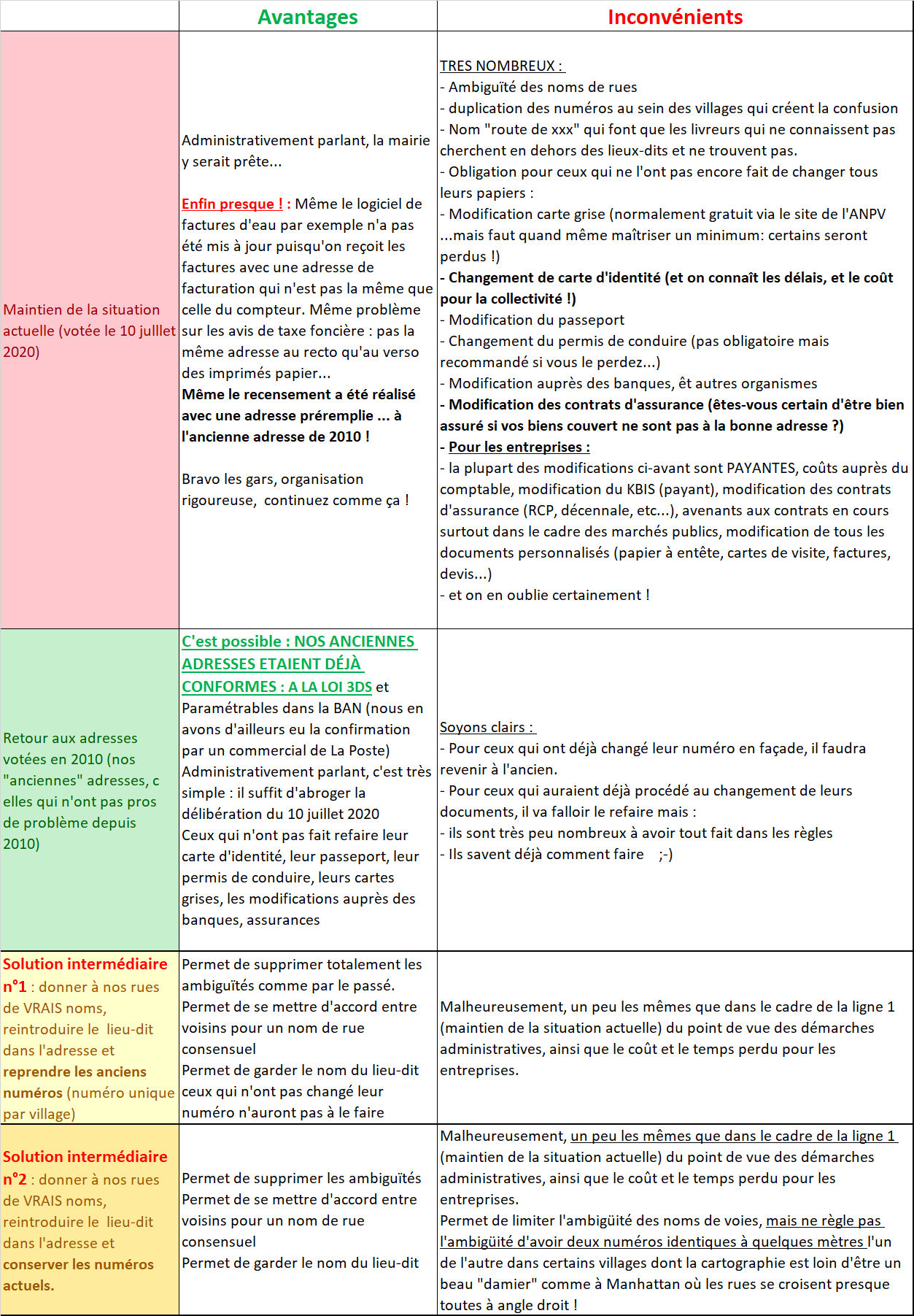 Avantages et inconvénients des différentes possibilités :